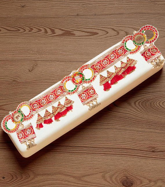 This beautiful red handmade Toran features a unique circle design with Ganesh Ji motifs, decorated using traditional Gota Patti work. Perfect for your home temple, entrance, or doorway, it adds a festive and spiritual charm to your décor. The vibrant red color and intricate craftsmanship make it an ideal choice for weddings, festivals, and special occasions.