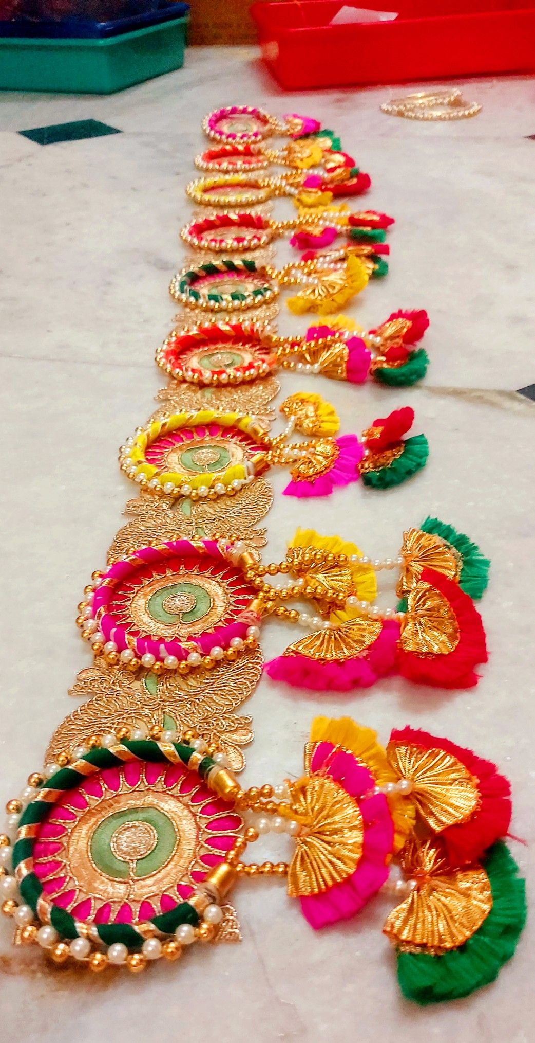 Add festive charm and positivity to your home with this beautifully handcrafted toran bandarwal. Adorned with vibrant multicolor fabric, golden embroidery, pearls, and tassel embellishments, it brings a traditional yet stylish look to any doorway. Ideal for decorating your main entrance, mandir, or living room, this toran symbolizes prosperity and warmth, making it perfect for Diwali, Navratri, weddings, Ganesh Chaturthi, and other celebrations. Its rich detailing and handmade craftsmanship make it a stunning décor piece as well as a thoughtful gift for loved ones during festivals.