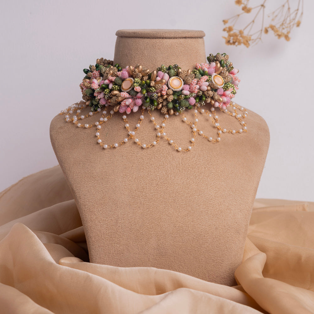 Make a bold yet graceful statement with this handcrafted floral choker necklace, designed to enhance your ethnic or fusion attire. Featuring intricate clusters of pastel pink, green, and golden artificial buds, this choker is beautifully accented with pearl bead chains that form a delicate drape around the neckline. The embedded kundan-style embellishments add a traditional touch, making it perfect for Haldi, Mehndi, Sangeet, or festive celebrations.