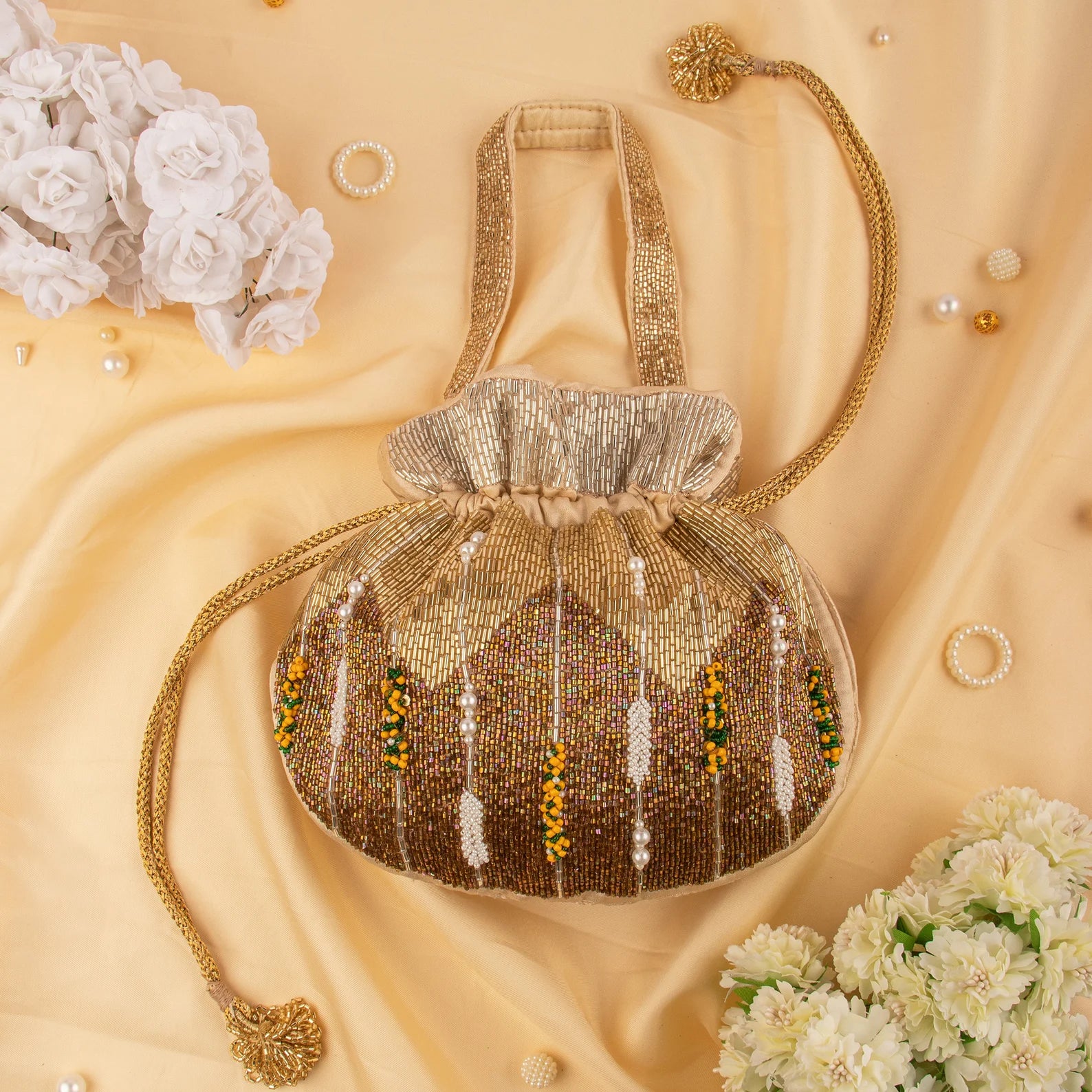 Elevate your style with this beautifully hand-embroidered wedding potli bag, designed especially for women. Perfect for brides or as a statement accessory for evening and cocktail parties, this luxurious drawstring purse combines traditional elegance with modern flair. Its intricate embroidery and elegant design make it a must-have for special occasions, adding a touch of charm and sophistication to any outfit.