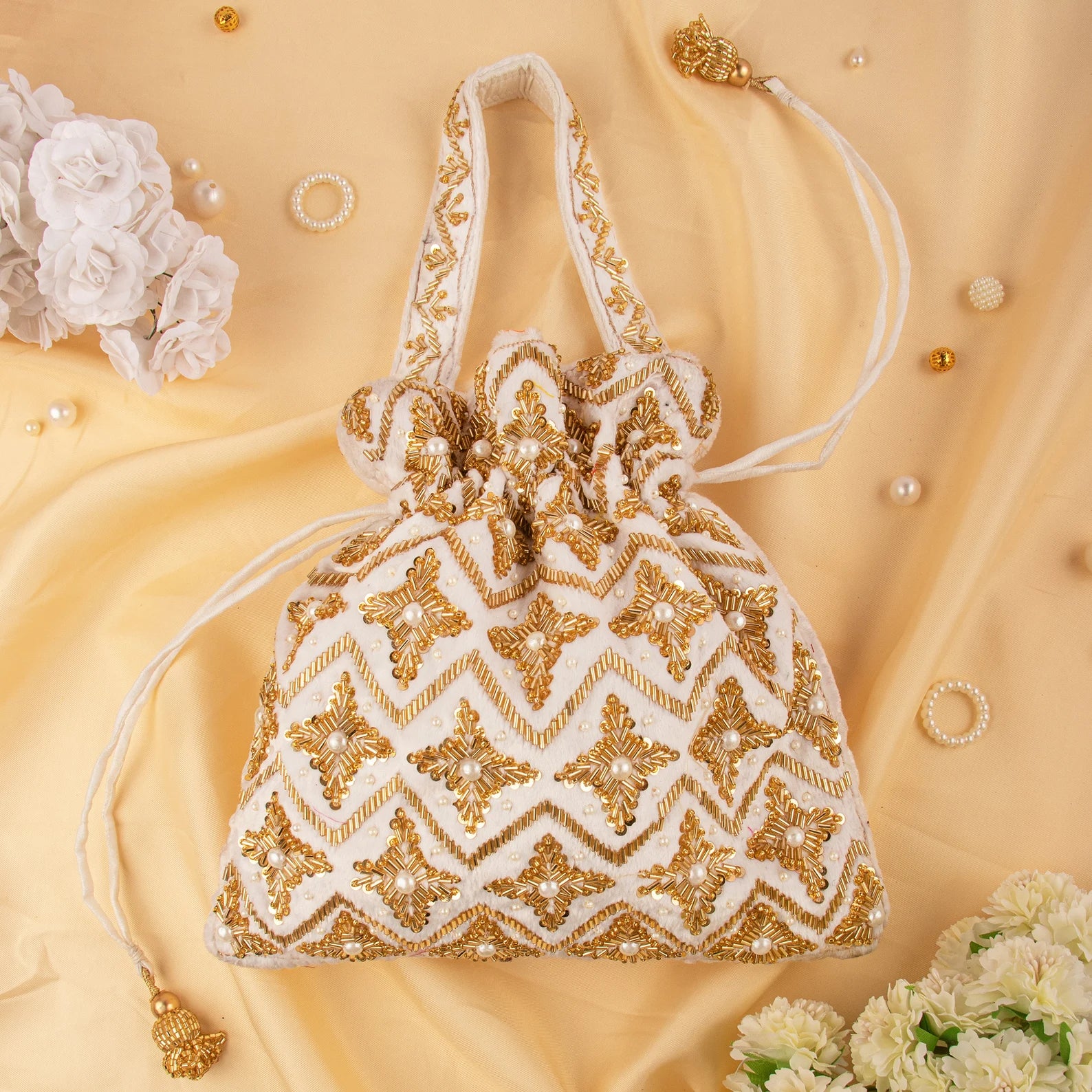 Add timeless elegance to your bridal or festive look with this Ivory Velvet Potli Bag, beautifully embellished with golden sequin and bead embroidery. Designed with a designer-inspired touch, this handcrafted drawstring purse is perfect for weddings, evening events, and special celebrations. The soft velvet material and detailed embroidery offer a perfect blend of tradition and modern style.