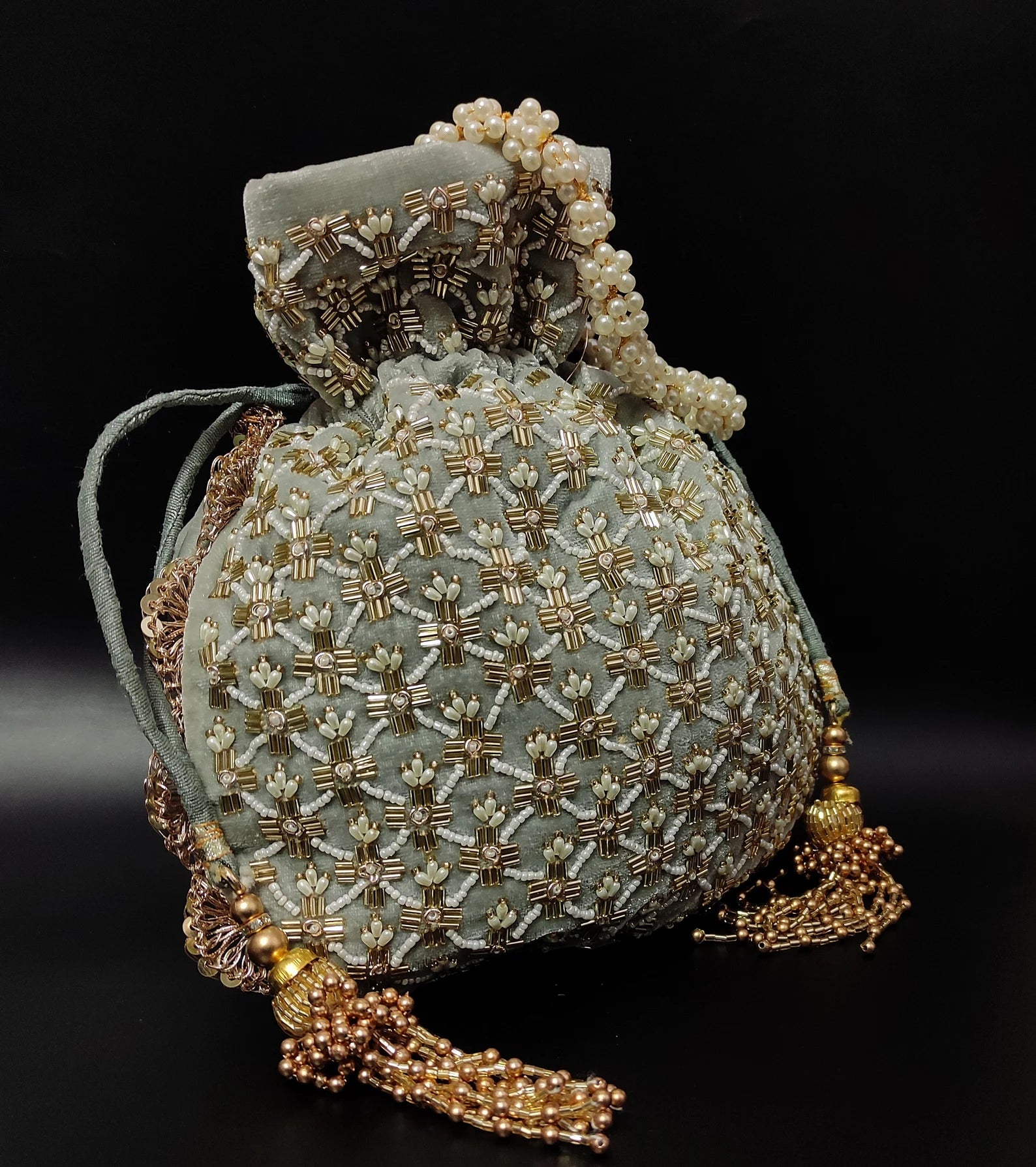 Add a touch of elegance to your special occasions with this gray velvet potli purse, beautifully embellished with golden tube lights and pearl beads. Designed as a stylish wedding favor or evening accessory, this handcrafted pouch features a chic beaded chain for easy carrying. Perfect for weddings, festive events, or gifting, it blends luxurious detail with timeless charm.