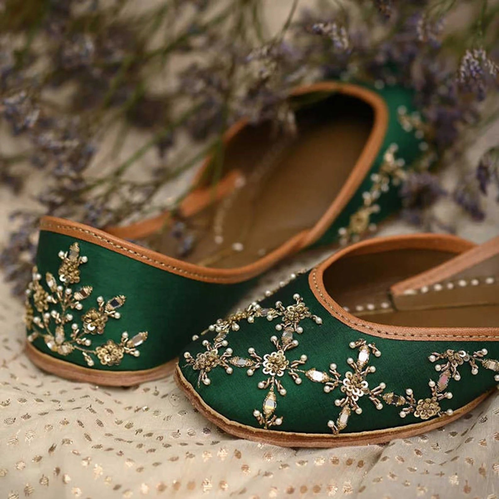 These beautiful green juttis are made with rich silk on the outside and soft genuine leather inside for comfort. The front showcases an elegant jaal (net-like) design, while the back features a traditional floral pattern inspired by Mughal art. Hand-embroidered with zardozi, mirror work, sequins, and faux pearls, this pair adds a royal and festive touch to any outfit. Perfect for weddings, celebrations, or special occasions.