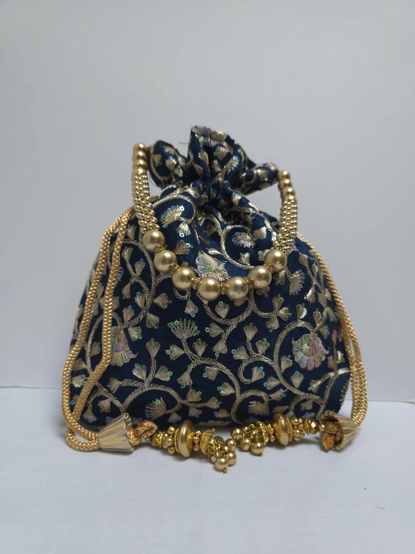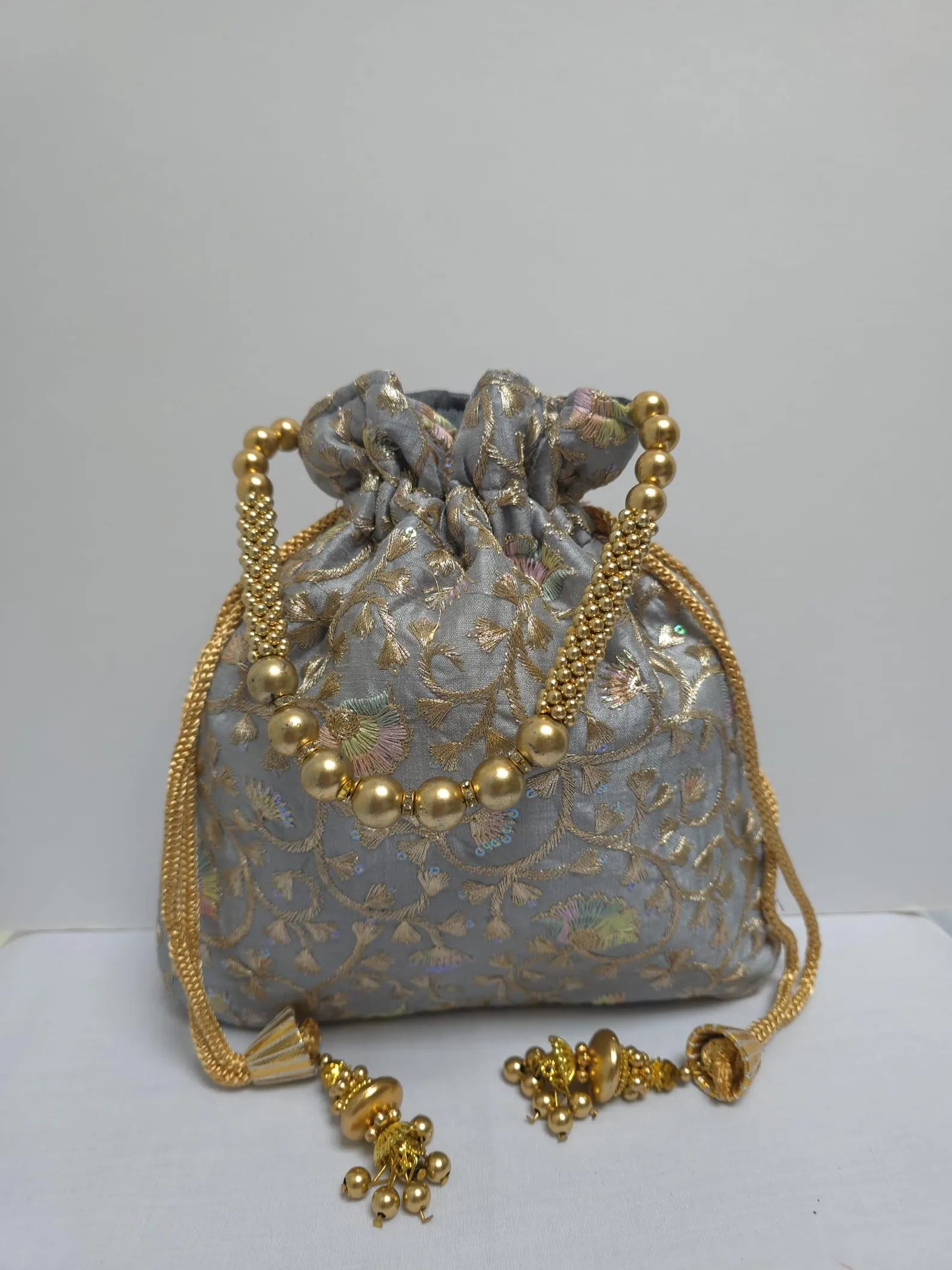 Brightly colored silk potli bag with beaded handle and thread embroidery. beautifully and ethnically created by Rajasthani artists. With its exquisite embroidery design, it looks stunning wherever you go. Perfect for carrying a phone, makeup, and other items. The item can be utilized for any occasion, including wedding parties. Additionally, this product would make a perfect return present for anybody.