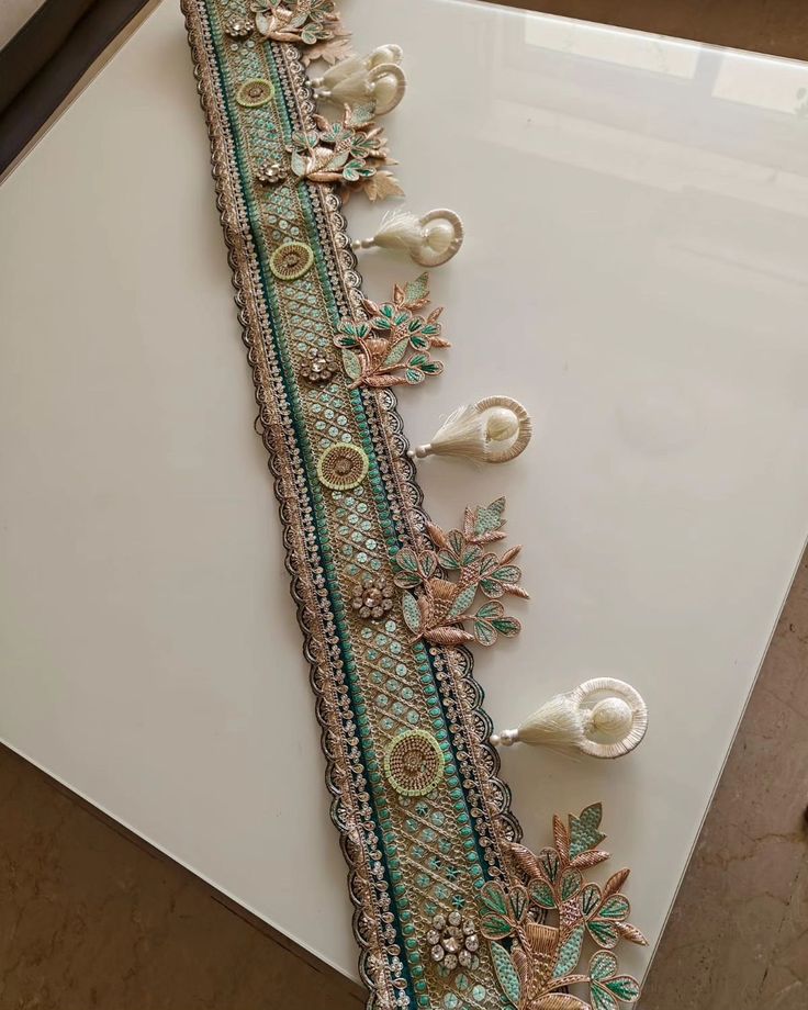 This elegant mirror work Bandarwal is a perfect blend of tradition and craftsmanship, designed to elevate the beauty of your home decor. Made with intricate detailing, it features sparkling mirror work at the center, bordered with golden embroidery and scalloped lace edges. Delicate pearl tassels hang gracefully along the side, adding a touch of charm and sophistication. The design is further enhanced with beautifully embroidered floral and leaf motifs in shades of gold, green, and beige, giving it a rich and festive appeal. Whether it's for a wedding, Diwali, Raksha Bandhan, or any traditional celebration, this Bandarwal is ideal for adorning your main door, pooja space, or living area. It brings positivity, grace, and a warm welcoming vibe to any space.