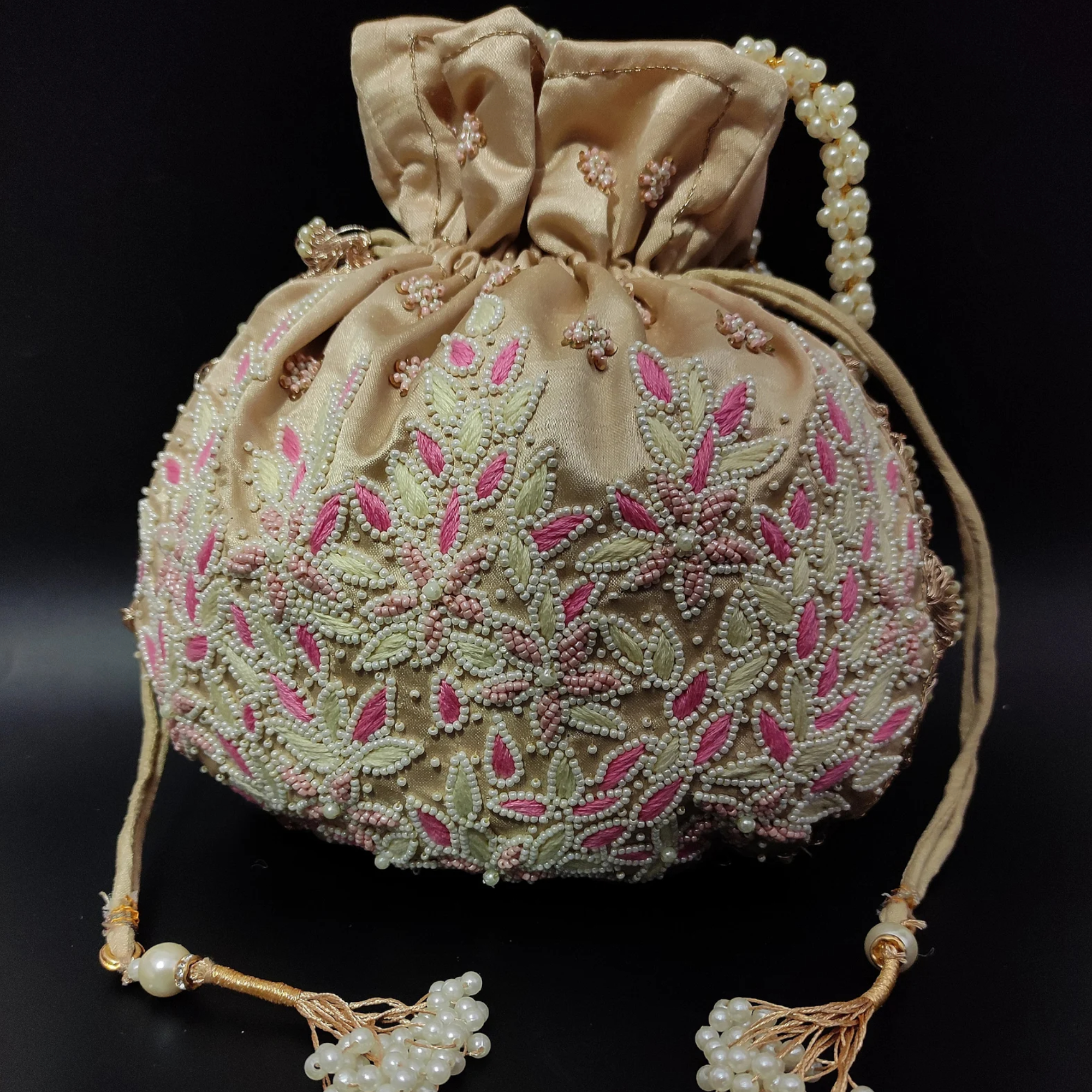 Add elegance to your festive look with this pink and beige thread embroidered potli bag, beautifully adorned with multi-color motif beading. Made from golden satin silk, this designer-inspired drawstring evening bag comes with a sturdy handle for easy carry. The detailed embroidery combines traditional charm with a modern flair, making it a perfect accessory for weddings, parties, or special occasions.