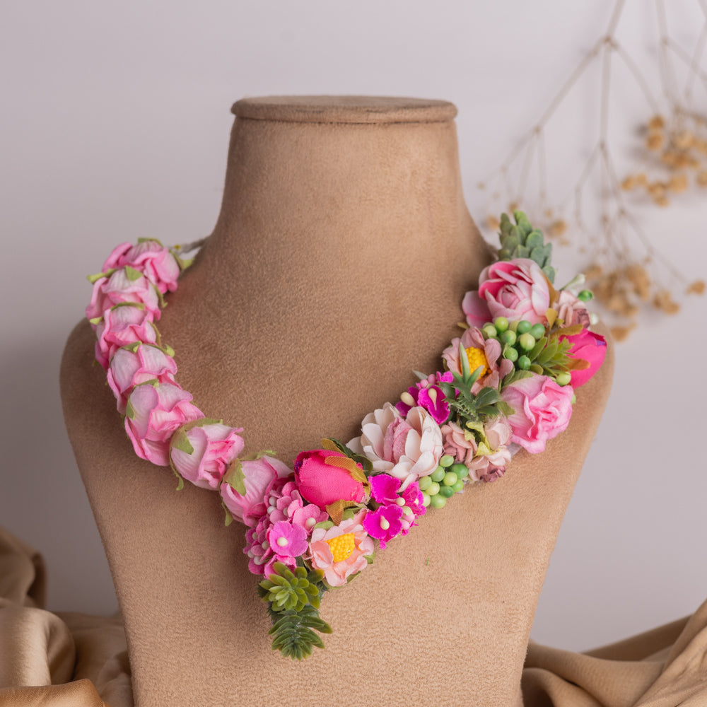 Bright and beautiful, these pink floral and green leaf jewelry are the perfect accessory for your pre-wedding and festive outfits. Handcrafted with lifelike flowers, they add a soft, feminine touch to your look. Whether you're attending a Haldi ceremony, Mehndi function, or any festive event, these lightweight earrings will keep you stylish and comfortable all day long. A must-have for your floral jewelry collection!