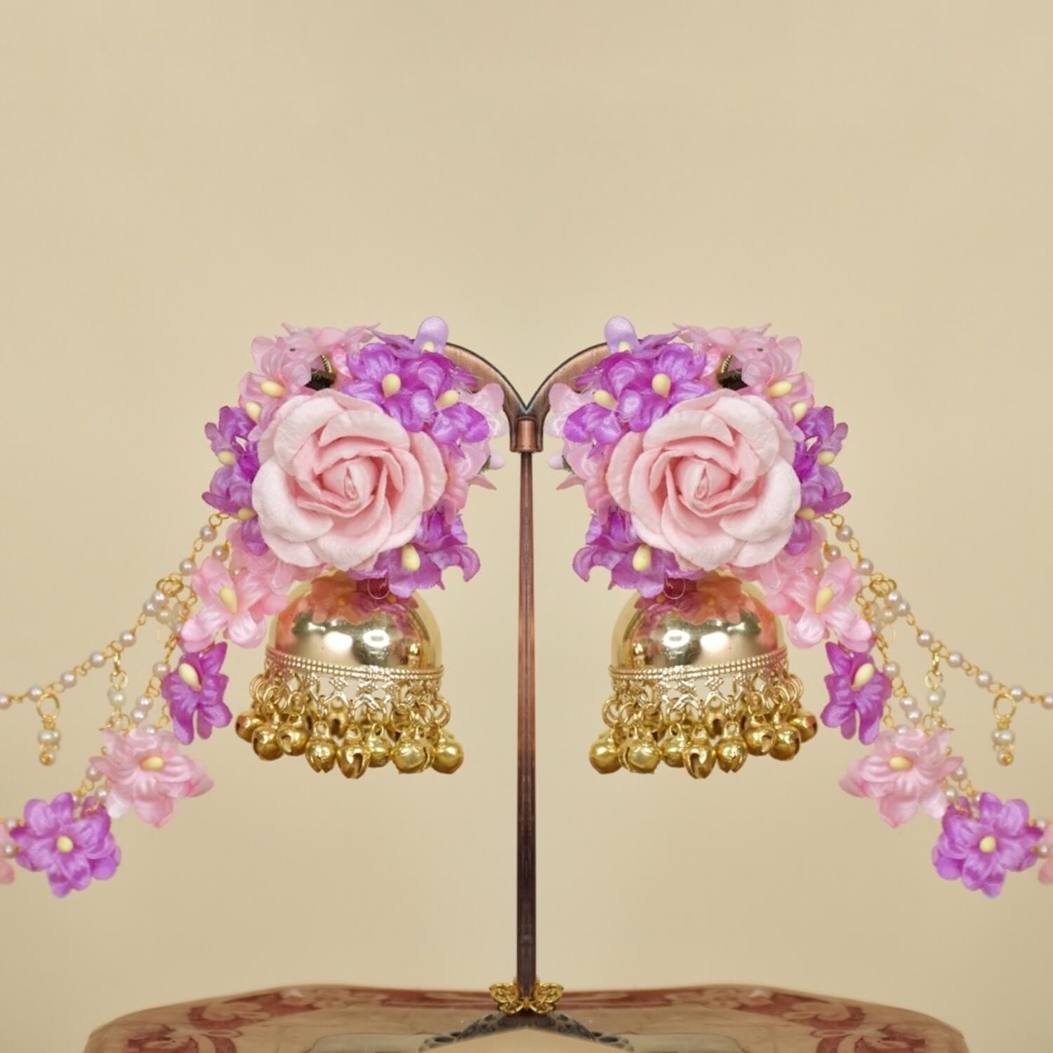 Add a vibrant touch to your ethnic wardrobe with these stunning jhumka earrings. Designed with intricate pink and purple floral accents, these earrings combine elegance with traditional charm. The handcrafted flowers sit beautifully atop a golden jhumka base adorned with tiny bells that create a soft, pleasant chime as you move. Whether you're dressing up for a wedding, festival, or special celebration, these earrings are sure to turn heads and complement your outfit with grace and color.
