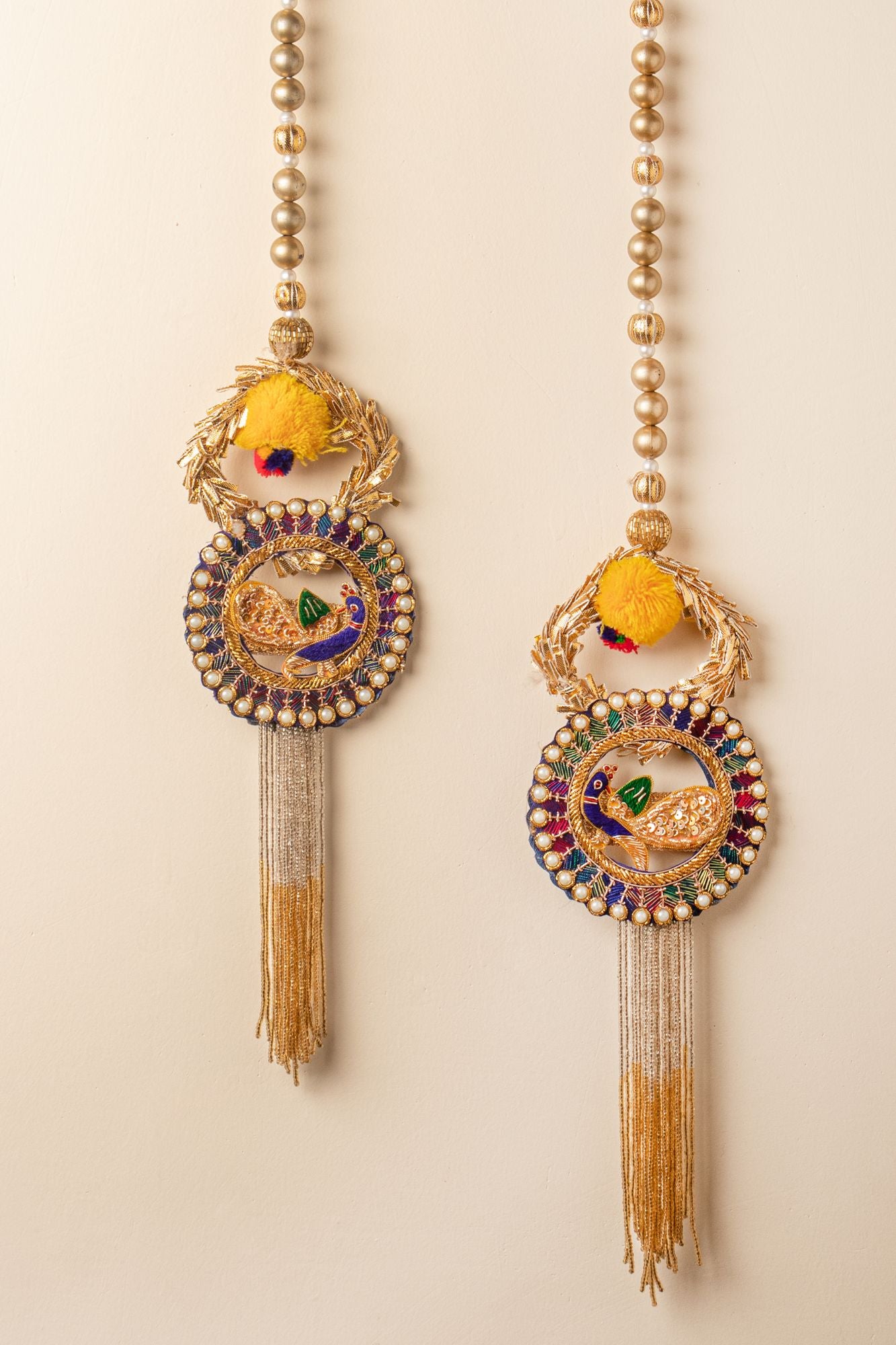 Elevate your home decor with this stunning pair of peacock-themed latkan hangings, crafted with golden beads, vibrant embellishments, and traditional motifs. Featuring a detailed peacock centerpiece encircled by colorful stones and shimmering pearls, each latkan is adorned with bright yellow pom-poms and elegant golden tassels. The top loop allows for easy hanging on doors, walls, or mandirs. Perfect for festivals, weddings, or housewarming ceremonies, these decorative hangings bring grace, tradition, and a festive vibe to any space. A beautiful fusion of elegance and heritage, this pair makes a perfect gift as well.