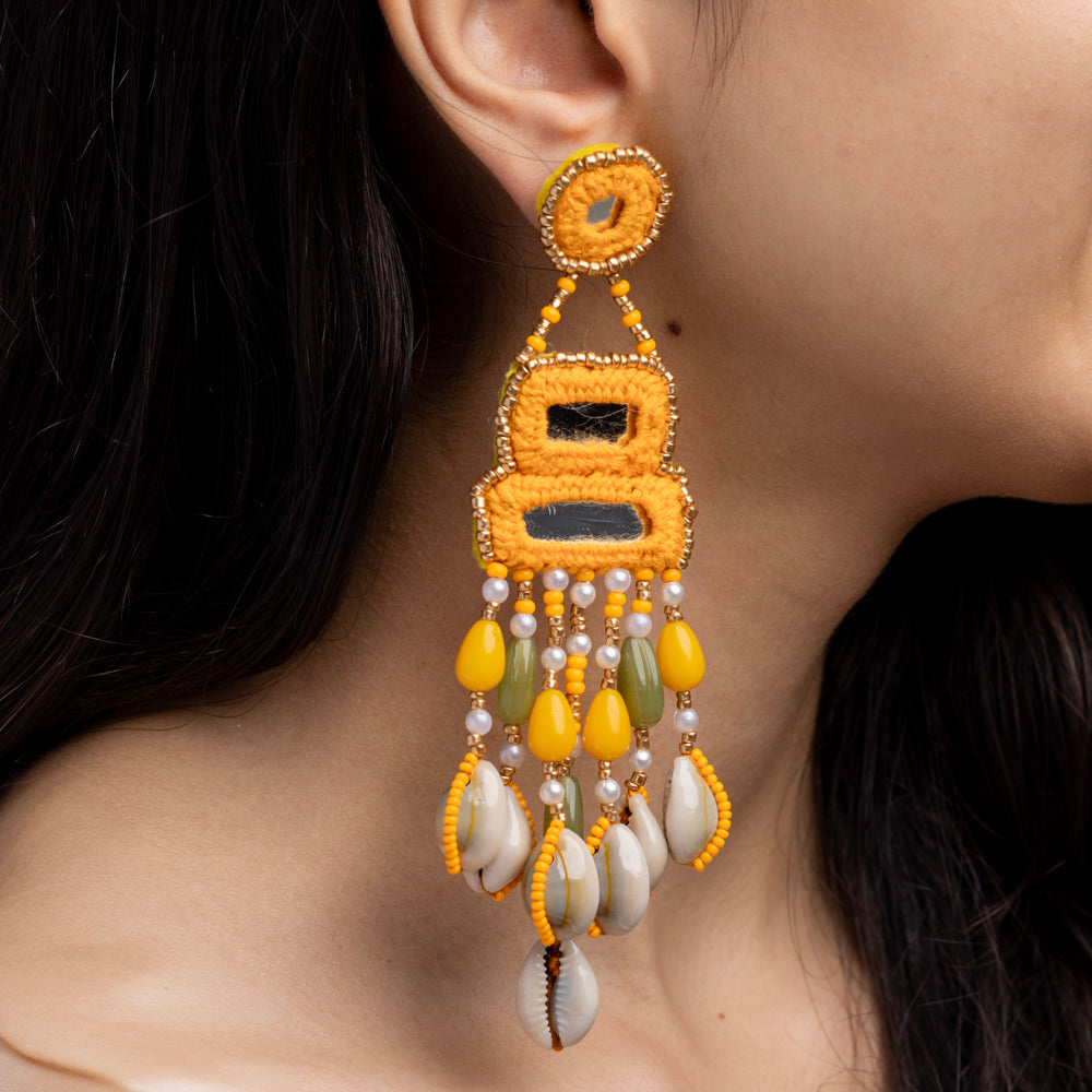 These stunning handcrafted earrings and maang tikka are the perfect balance of tradition and style. Featuring a stacked design of crochet mirror frames, yellow and olive teardrop beads, mini pearls, and cowrie shell tassels, they bring a pop of color and movement to your look. The earrings and tikka are designed for pierced ears and are lightweight enough for all-day wear—ideal for weddings, festive occasions, or bold everyday fashion.