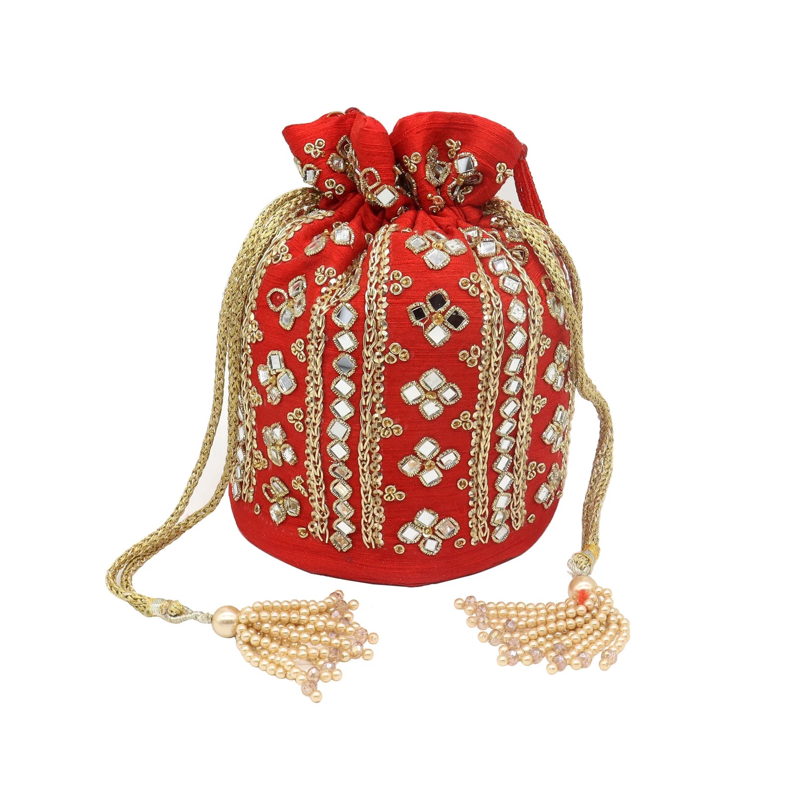 This beautifully handcrafted round potli bag features intricate Zardosi and mirror work embroidery, making it a perfect accessory for weddings and festive occasions. Made with premium materials and designed with care, it pairs well with both Indian and western outfits. Its compact size is ideal for carrying your essentials like keys, phone, or makeup. With its eye-catching design and elegant look, this drawstring pouch also makes a lovely gift for bridesmaids or any special woman in your life.